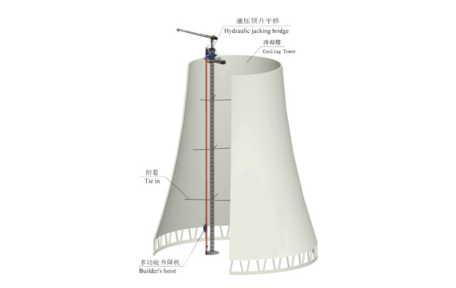該機可以做到一機多用,是運送鋼筋、混凝土及施工人員的三合一型設備,廣泛應用于電力建設中的煙囪和冷卻塔施工。