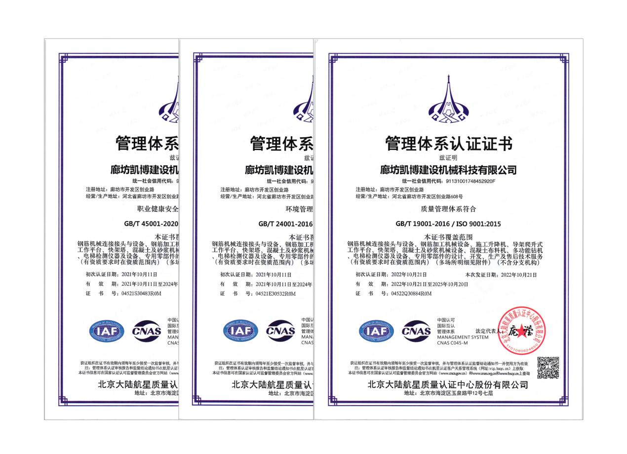 2022年9月26日至30日,北京大陸航星質量認證中心股份有限公司對廊坊凱博建設機械科技有限公司開展了為期5天的質量、環境、職業健康安全管理體系外審工作,在公司領導的高度重視和各職能部門的積極配合下,外審工作順利完成。